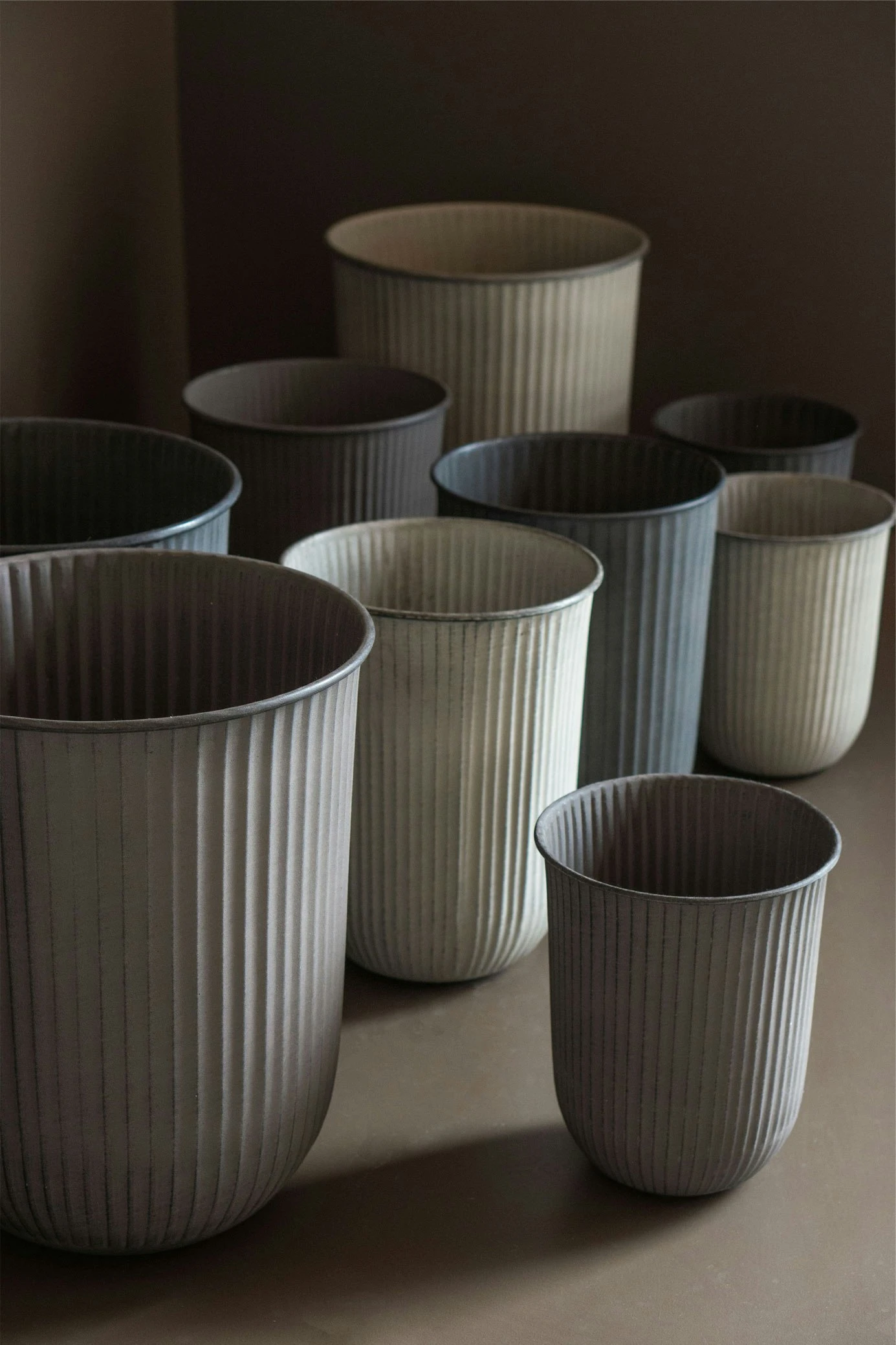 Die Töpfe von DBKD haben ein stilvolles, verschieden großes Design aus Blech mit schöner, langlebiger Glasur perfekt für die Verwendung im Freien und dekorativen Streifen auf der Außenseite. Es stehen verschiedene Farben zur Auswahl.