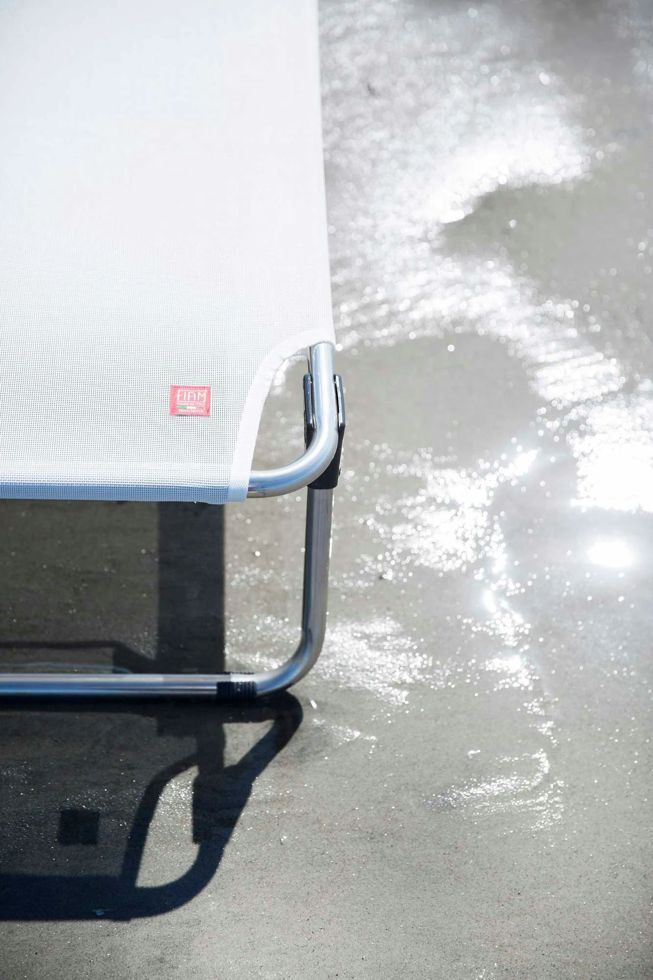 Amigo ist eine klassische Sonnenliege der italienischen Marke Fiam, welche in drei verschiedenen Positionen verstellbar ist. Die Sonnenliege kann einfach zusammengefaltet werden und hat einen Griff, der das Tragen erleichtert. Amigo’s Gestell ist aus Aluminium gergestellt und ihr Stoff ist abnehm- und waschbar, was die Liege wetterfest und wartungsfrei macht. Das Nackenkissen ist nicht inkludiert.