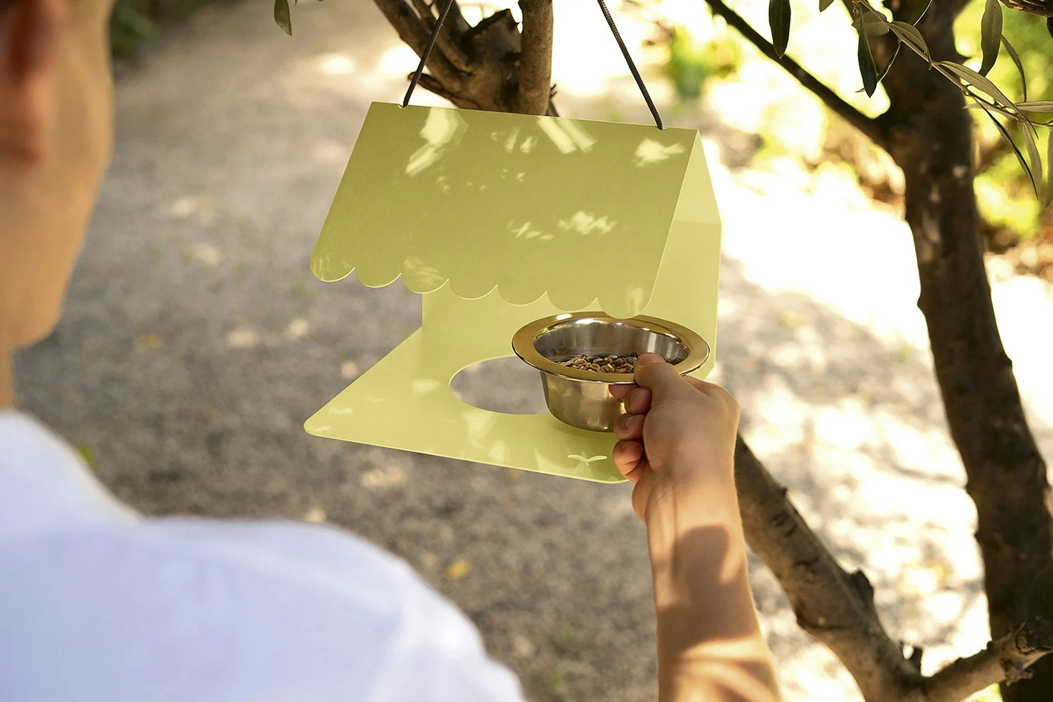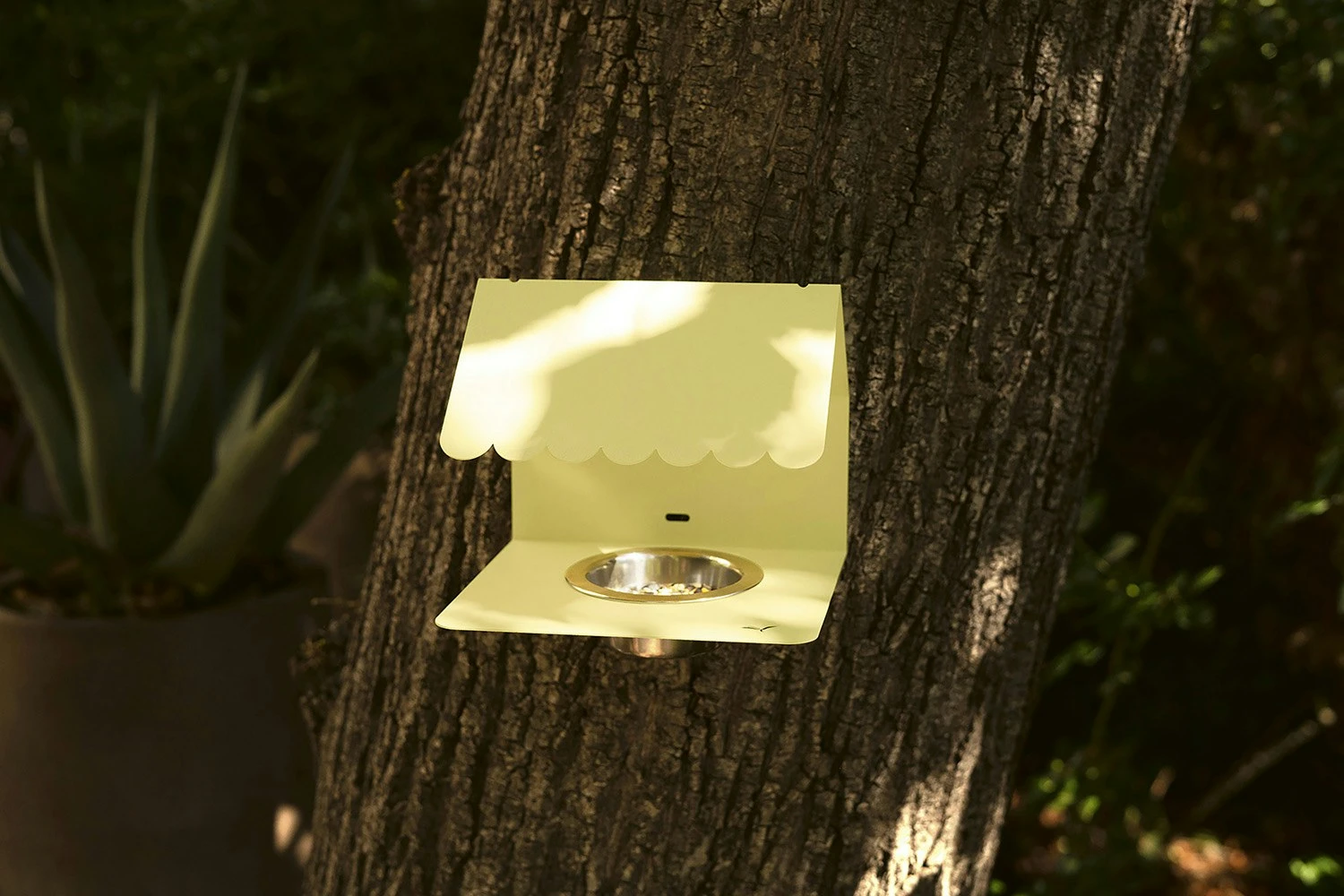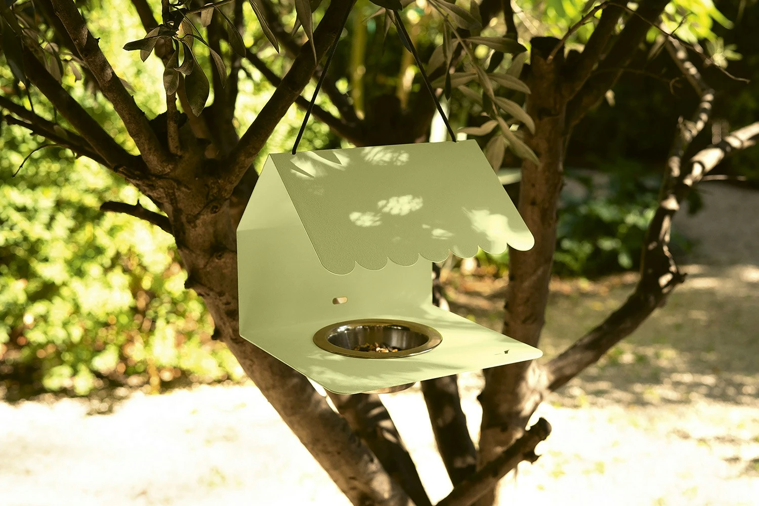 Es hat eine verspielte Form wie ein Baumhaus, das die Vögel leicht erreichen können. Ein charmantes Detail für Balkon, Terrasse oder Garten, das wahlweise mit Samen oder Wasser befüllt werden kann. In Frankreich hergestellt. Entworfen von Catherine Sofia.